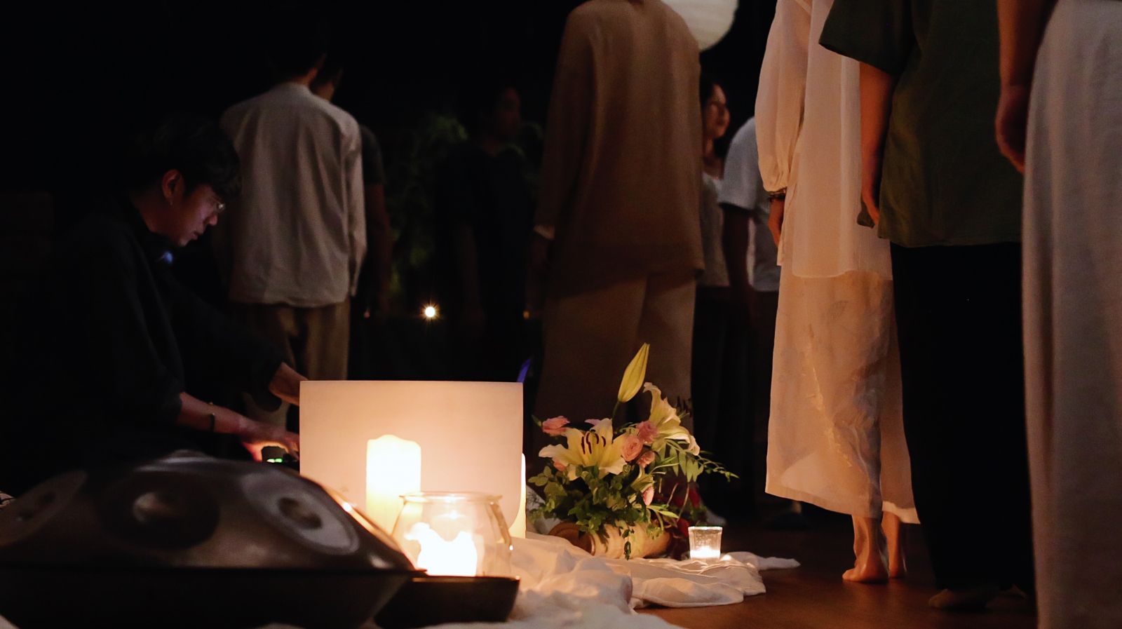 療癒學院張逸軍老師,輕聲帶領我們或坐、或臥、或行,每一個姿態不只是動作,而是與自己更深層的連結。在靜心與肢體的引導下,卸下防備,彷彿靈魂間,有某種默契的共鳴。頌缽與鍵盤手空靈的樂音在空氣中流轉,不僅身體放鬆,心也變得柔軟。