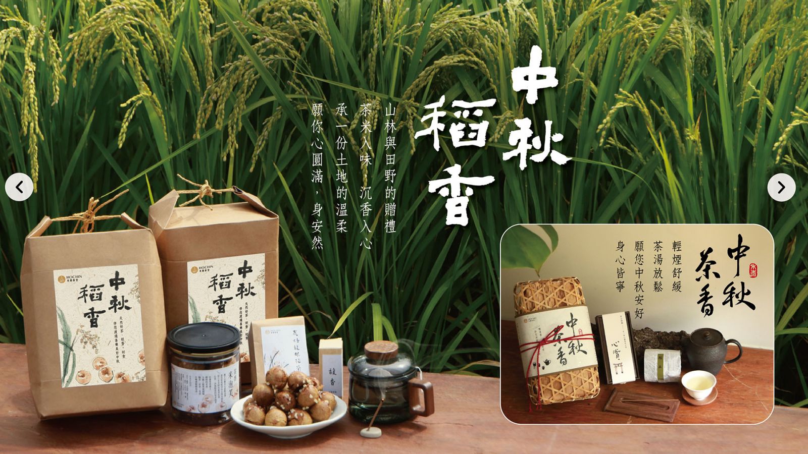 【中秋稻香】選用宜蘭小農友善耕種稻米與獨家蜜香紅茶口味的米泡芙,搭配無咖啡因天然花茶,與禾青經典的純天然沉香線香。
