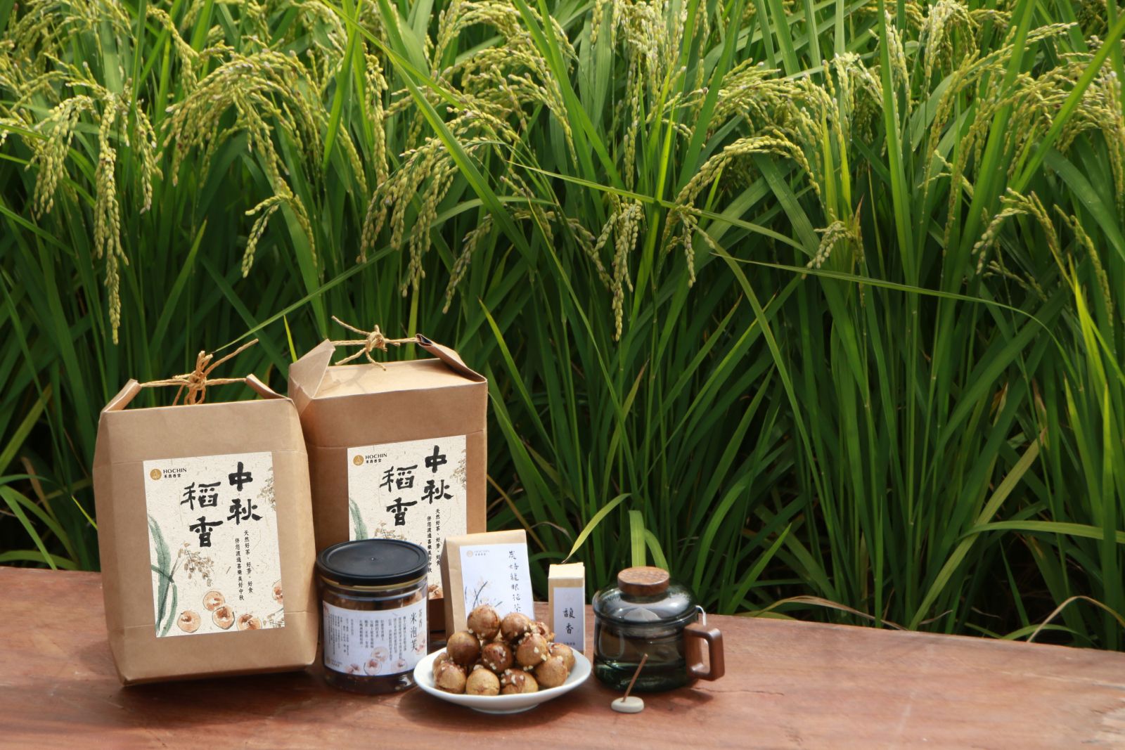 【中秋稻香】選用宜蘭小農友善耕種稻米與獨家蜜香紅茶口味的米泡芙,搭配無咖啡因天然花茶,與禾青經典的純天然沉香線香。